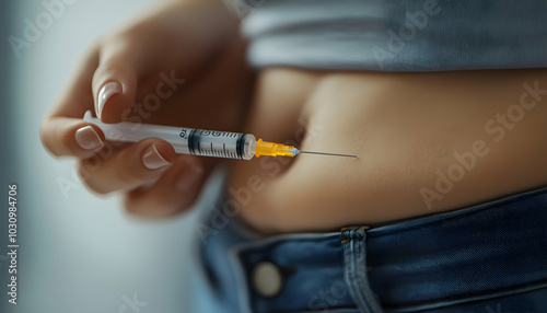 A woman administering a hormonal injection to her stomach using a pen syringe, highlighting medical treatments for figure correction or diabetes.