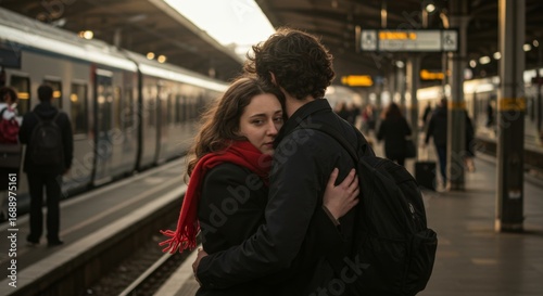 A woman and man hugging at a train station platform. Emotional goodbye or reunion moment. Travel and relationship concept for couples.