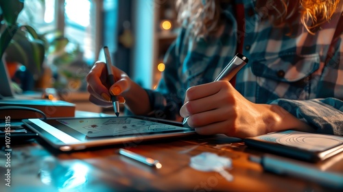 A woman draws on a tablet with a stylus.