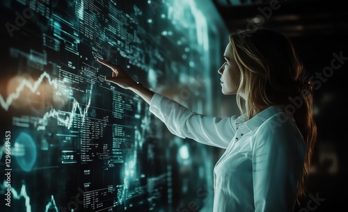 A woman effortlessly operates a holographic system, showcasing the power of generative AI in a sleek, tech focused environment.