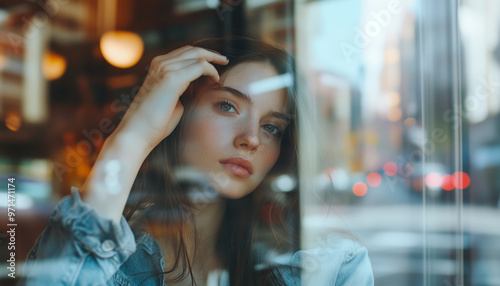 A woman fixing her hair in the reflection of a store window, with city lights reflecting in the window glass