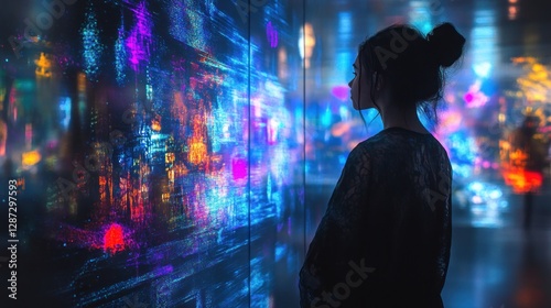 woman, city landscape, digital, futuristic, light, neon, screen, display, technology, modern, girl, urban, night, dark, colourful, vibrant, glowing, bright, artistic, abstract, silhouette, mystery, intriguing, dreamlike, surreal, mesmerizing, captivating, hypnotic, enigmatic, thoughtful, contemplative, pensive, observing, admiring, fascinated, interactive, datum, information, pixel