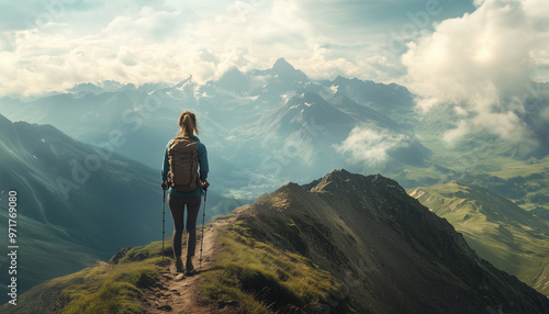 A woman hiking alone on a mountain trail, vast landscape in the background