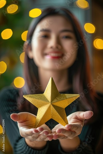 A woman holds a gold star in her hands, symbolizing achievement and recognition