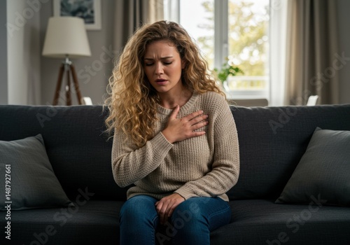 A woman holds her chest while sitting on a couch, showing signs of discomfort and possible pain.