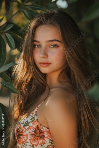 A woman in a beautifully patterned dress stands amidst vibrant greenery, exuding elegance and natural grace.
