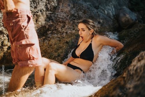 fun, leisure, travel, scenic, missy, nature, surprised, exploration, mountain, outdoors, moment, summer, wet, cool, expression, rock, stream, bikini, hiking, enjoying, tour tourism, water, refreshing, relaxing, chill, flowing water, fresh, sunlight, active, reaction, river, woman, enjoyment, relaxation, landscape, splash, recreation, vacation, shock, adventure, calming, temperature, female, energy, happy