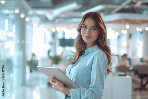 woman, blue, shirt, tablet, technology, digital, hand-held, computer, device, user, interface, personal, assistant, communication, cyberspace, mobile, electronic, innovation, modern, contemporary