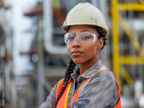 A woman in a hard hat and safety glasses.
