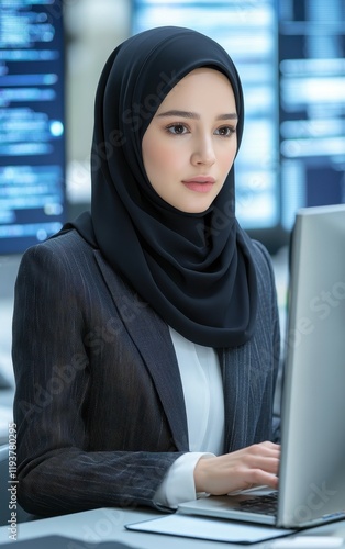 A woman in a hijab focuses intently on her computer in a sleek office space filled with digital screens displaying data, highlighting a modern and productive atmosphere