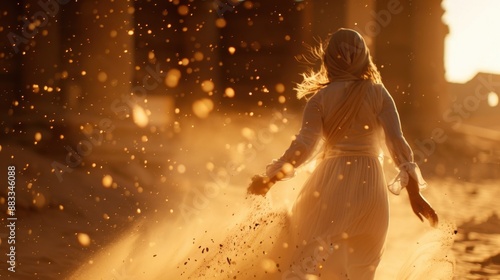 A woman in a long dress is standing in a sandy area with a lot of dust