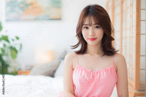 beauty, person, female, woman, pretty, adult, attractive, lifestyle, young, portrait, relaxation, home, asian, white, cute, bed, bedchamber, morning, lady, lying, asia, face, resting, hair, room, healthy, chinese, brunette, bright, japanese, fresh, concept, house, background, sleep, arousing, model, health, indoor, sunlight, day, happy, light, fashion, view, apartment, comfortable, smile, leisure