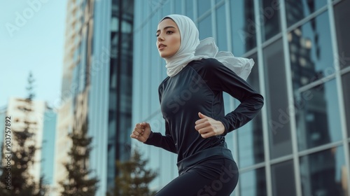 woman, female, running, runner, jogging, athlete, sport, fitness, exercise, physical exercise, healthy, active, lifestyle, urban, city, building, skyscraper, glasses, modern, architecture, window, street, outdoors, day, sunlight, bright, white, headscarf, muslim, islam, clothing, black, pant, leggings, shirt, top, face, focused, determined, motivation, energy, movement, motion, speed, fast, dynamic, perspective