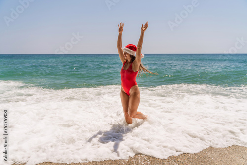 A woman in Santa hat on the seashore, dressed in a red swimsuit. New Year's celebration in a hot country.
