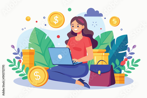 A woman is engaged in online shopping while seated on the floor, surrounded by coins and shopping items Woman shopping online, sitting on a coin, flat illustration.