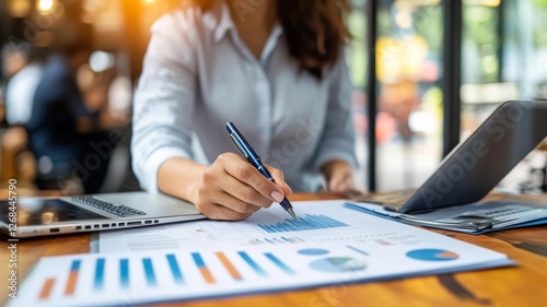 A woman is focused on analyzing colorful charts and graphs on a desk, using a pen to take notes. A laptop and documents are visible as she works in a bright, contemporary office environment