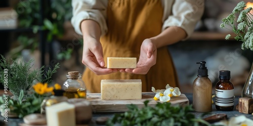 A woman is holding two bars of soap on a wooden cutting board. The soap bars are placed on top of each other, and there are several bottles and vases around them