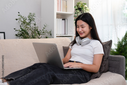 person, laptop, sofa, computer, technology, lifestyle, sitting, woman, relaxation, female, cyberspace, one person, young adult, living room, happiness, smiling, modern, working, looking, comfortable, connection, online, using, apartment, cyberspace, living, room, home, home interior, enjoyment, typing, casual clothes, job, lady, computer monitor, earphones, long hair, emotion, entertainment, learn, network, open, training, watching, device, blank, holding, casual attire, earphones