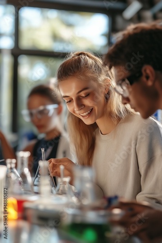 A woman is smiling at a man while they are both looking at a table full of scientific equipment