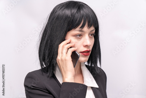 smartphone, woman, female, expression, person, beauty, young, face, attractive, background, pretty, hair, isolated, portrait, adult, emotion, unhappy, caucasian, 1, white, brunette, phone, cute, looking, hand, model, studio, upset, depression, stress, stressed, posing, coiffure, curly, care, mobile, skin, fashion, sorrowful, displeased, problem, bad, copy space, thoughtful, business, style, glamour, grey, businesswoman
