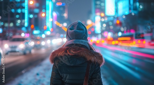 woman, person, lady, looking, night, back, pretty, face, female, rear, 1, portrait, outside, light, caucasian, unrecognizable, young, hat, adult, red, cute, alone, lifestyle, blue, concept, outdoors, holiday, leisure, celebration, vacation, evening, urban, walk, bokeh, background, cold, snow, beautiful, holiday maker, winter, city, street, tour tourism, backpack, europa, autumn, view, hipster, traveler