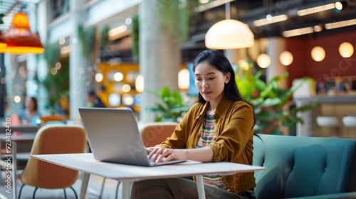 A woman is working on her laptop in a modern and colorful cafe lounge, enjoying a bright and relaxed atmosphere while focusing on her digital tasks in a comfortable environment.