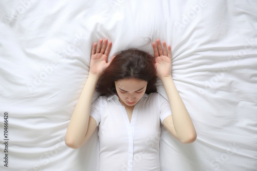 woman, bed, hand, head, white, sheet, bedchamber, relaxation, rest, sleep, sleepy, exhausted, fatigue, stress, anxiety, depression, insomnia, pillow, duvet, blanket, mattress, furniture, home, comfort, cosy, caucasian, one person