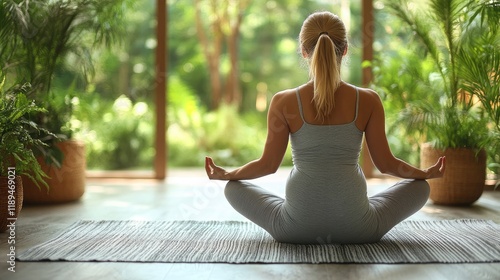 A woman meditates peacefully in a serene indoor space surrounded by plants.