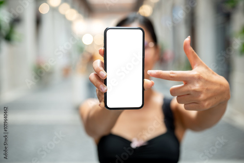 shopping, market, mall, supermarket, shopping centre, e-business, wireless, payment, banking, financial, travel, vacation, store, retail, shop, blank, mobile phone, connection, copy space, device, display, empty, female, hand, holding, cyberspace, lifestyle, message, mobile, mobile phone, modern, network, people, phone, screen, showing, smartphone, technology, template, woman, closeup, standing, pointing, finger, recommend, advice, advertise