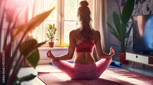 A woman practicing yoga and meditation in a cozy, sunlit room with plants and a television. She is seated on a yoga mat in a cross-legged position.