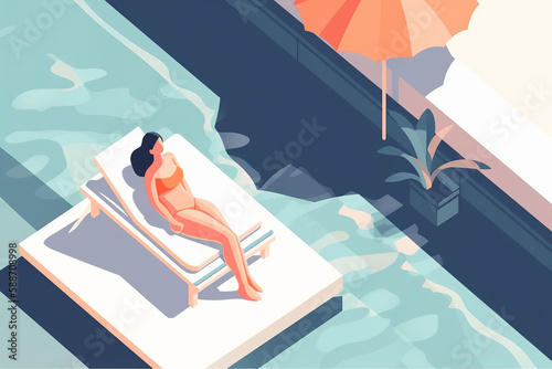 woman, travel, swimming pool, vacation, holiday, pool, tropical, summer, leisure, lifestyle, relaxation, resort, sun, poolside, spa, resting, water, girl, person, female, adult, tranquil, people, beauty, beautiful, holiday maker, wellness, luxury, hotel, serenity, swimming, pretty, fashion, body, relax, bikini, swimwear, paradise, ai, generative