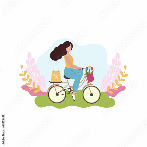 A woman rides a bicycle with flowers and shopping. Concept for Women's Day. Vector spring illustration in a pink color.