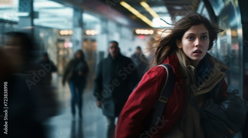 A woman runs through a train station, late for her flight, a frightened expression on her face
