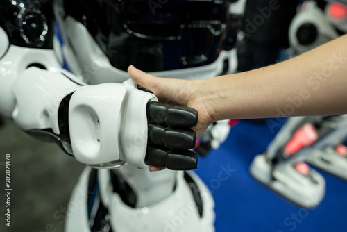 human, robot, handshake, android, artificial, autonomous, closeup, female, hand, industry, intelligence, machine, modern, robotic, science, service, tech, technology, white, woman