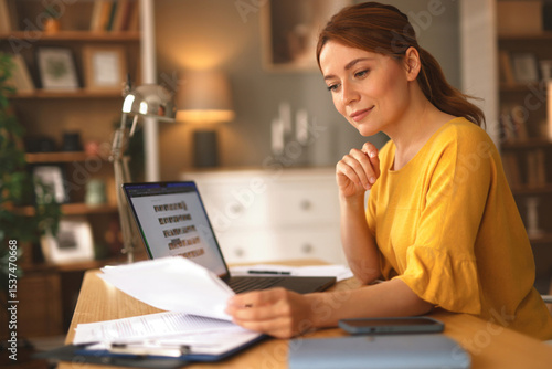 A woman sits at a desk in a well-lit living area, focused on reading documents while using her laptop. She has a thoughtful expression, creating a productive atmosphere.