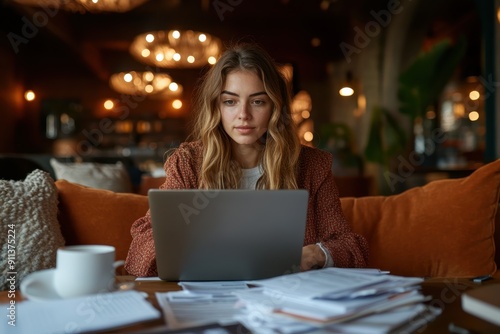 A woman sits at her laptop in a stylish, cozy room, surrounded by scattered papers, capturing the vibe of a modern and productive home workspace filled with tranquility.