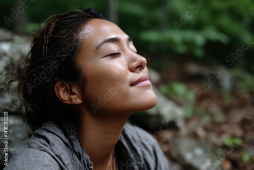 A woman sits in a lush natural setting, eyes closed and at peace, capturing a moment of joy and connection with the environment, embodying tranquility and freedom.