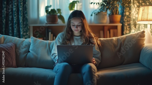 A woman sitting on a couch with a laptop, suitable for office or home use concept