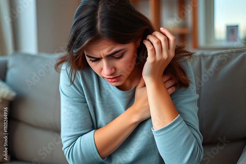 woman, people, phone, home, person, beauty, smiling, smile, sofa, face, sitting, mobile, phone, lifestyle, talking, indoor, hair, brunette, room, casual attire, sad, communication, lady, bed, 1