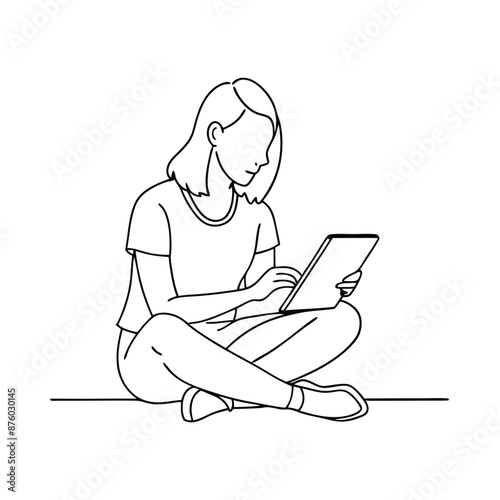 A woman sitting on the ground with notepad vector line art illustration