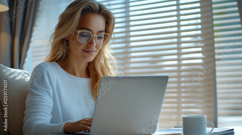 woman, sitting, sofa, working, laptop, notebook, coffee cup, nearby, technology, multitask, relaxation, stylish, interior design, comfortable, household, lifestyle, leisure, home office, sunlight, creativity, productivity, organisation, freelance, independent, entrepreneur, adult, caucasian, apartment, decor, contemporary, furniture, accessory, plant, elegant, peaceful, cosy, serene, urban, chic, smiling, laptop, office, browsing, using