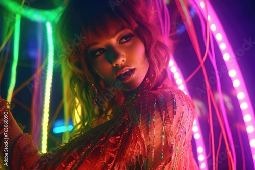 A woman standing in front of vibrant neon lights. Perfect for urban and nightlife concepts