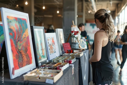 A woman stands beside a table displaying artistic creations, perfect for illustrations or editorial use