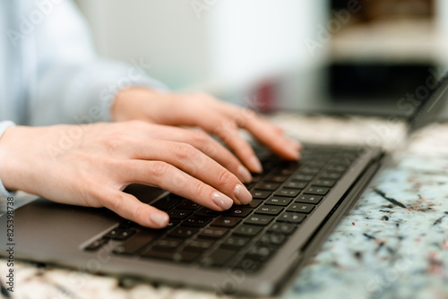 anonymous, body part, desk, desktop, hand, home, indoor, cyberspace, keyboard, laptop, office, online, to sit, typing, unrecognizable, use, work