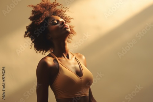 A woman wearing a tan top looks up. This image can be used to depict curiosity, wonder, or searching for inspiration