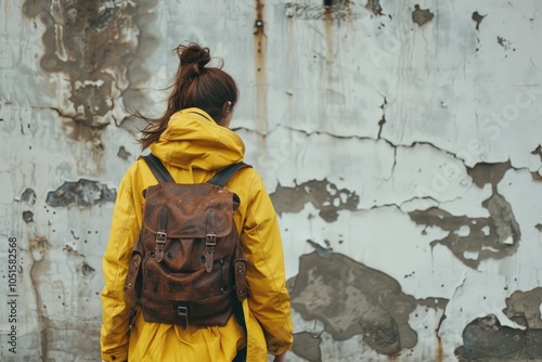 A woman wearing a yellow jacket and carrying a brown backpack on her back, possibly getting ready for a hike or outdoor adventure