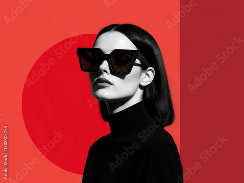 A woman wearing sunglasses and a black shirt stands in front of a red background