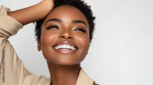 woman, big, smile, face, wearing, tan, jacket, female, beauty, hair, happy, young, person, cheerful, happiness, african, portrait, lady, background, black, adult, attractive, joyful, expression, skin, model, teeth, closeup, white, lifestyle, american, healthy, health, laughing, afro, style, fashion, mouth, dental, fun, ethnicity, cute, care, enjoy, whitening, cool, modern, fresh, natural