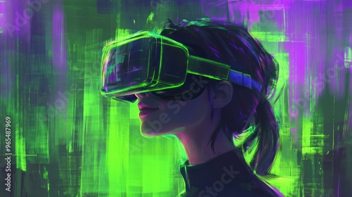 technology, headset, woman, female, futuristic, digital, future, innovation, interface, gaming, life events, screen, display, vision, earth, simulation, reality, adventure, interaction, goggles, artificial, artificial intelligence, digital artwork, portrait, avatar, abstract, colours, green, purple, gradient, line, background, graphic, illustration, design, vector