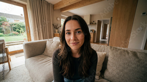 A woman with a warm gaze sits comfortably indoors, in a cozy living room, exuding a sense of peace and relaxation.